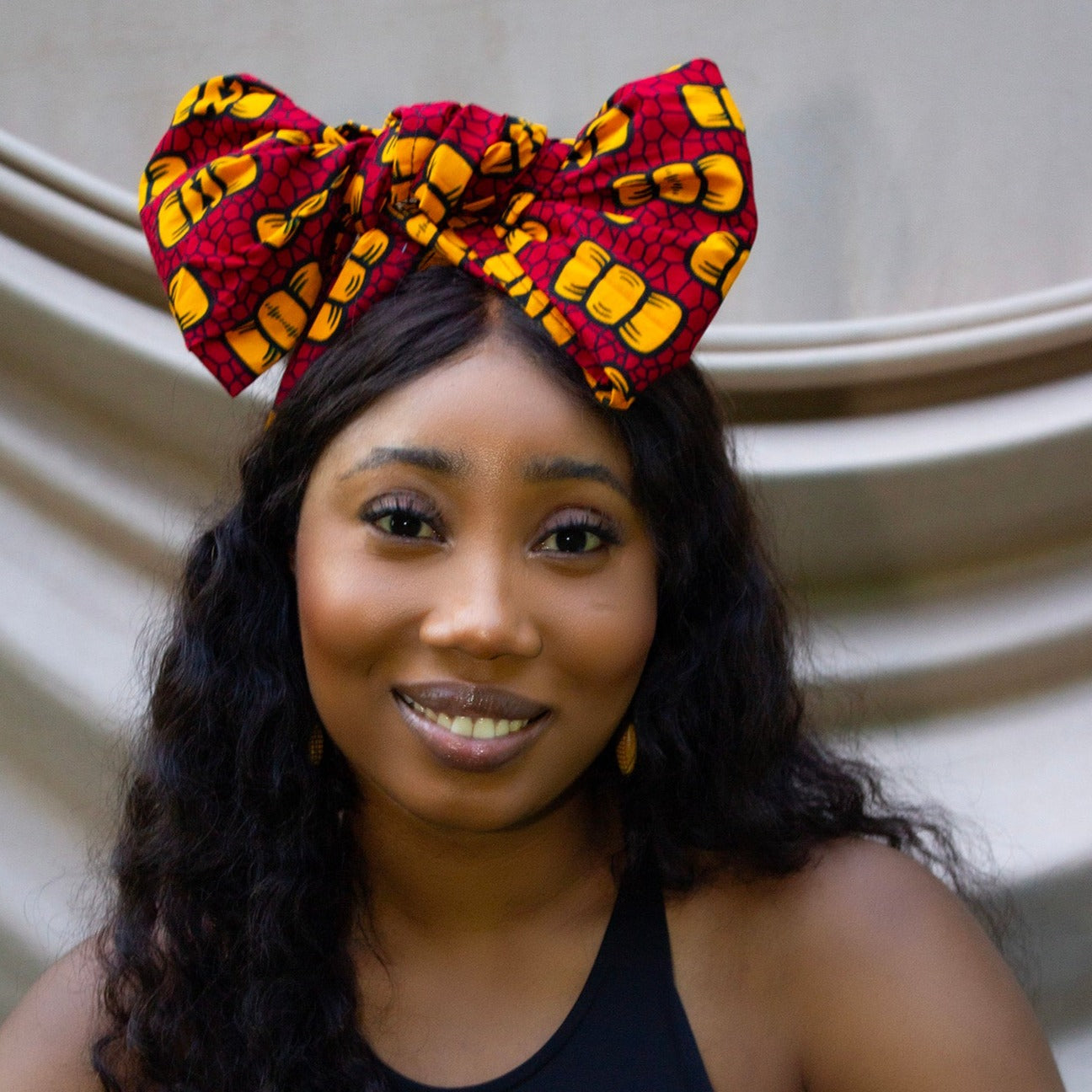 Hand crafted, ethically produced Ankara headwrap made from sustainably selected wax print in our vibrant red, yellow and black bow African print pattern.
